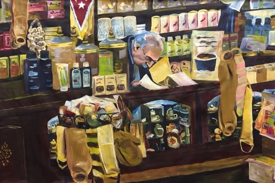 Dit schilderij neemt ons mee naar een bazaar in Istanbul. Wat mij hier fascineerde was hoe de winkelier opgaat in zijn winkeltje, de perfecte camouflage.