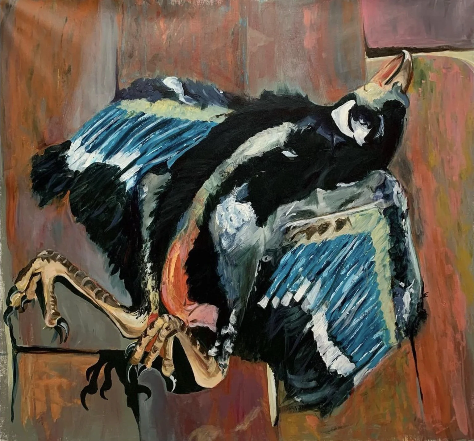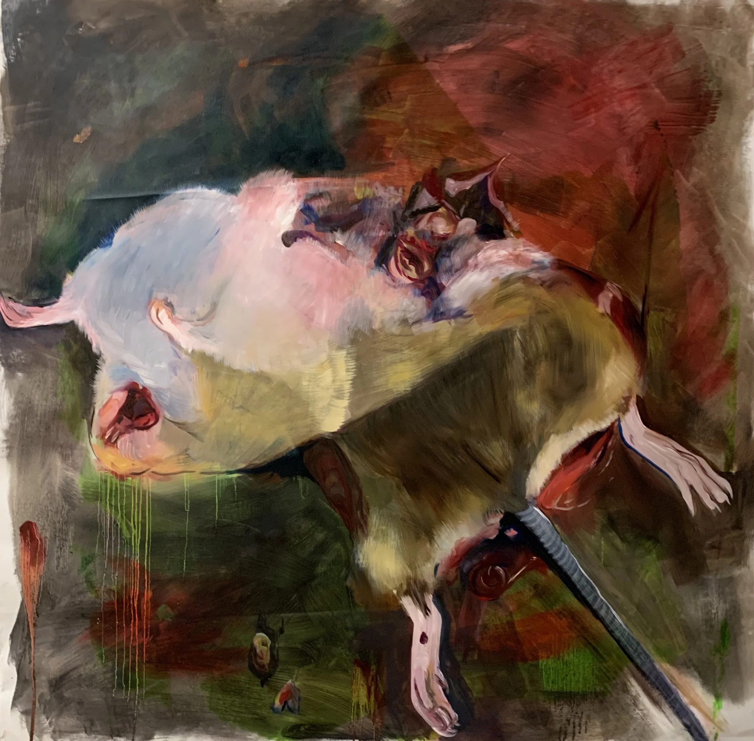 De 5 schilderijen van dode dieren roepen bij de ene afkeer op, anderen vinden die net interessant. Dit zijn allemaal roadkill-dieren. Maar ondanks het feit dat ze nutteloos gestorven zijn, zie ik er ook schoonheid in. Als je er niet langer een (vroeger) levend wezen in ziet, kan je de schoonheid van de kleuren zien, het contrast tussen inwendig en uitwendig, …