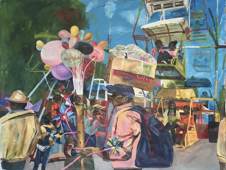 In dit schilderij reizen we naar Madagaskar. Daar stond deze man ballonnen te verkopen op de kermis. Het resultaat is een chaotisch beeld.